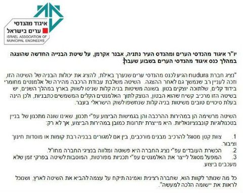 משרד הבינוי והשיכון מנסה בימים אלה להאיץ את קצב הבנייה בכל מחיר. יוזמה חדשה הינה לייבא חברות בנייה זרות עם עובדים זרים, שבאמת אין לנו צורך בכך. אם נאמץ את שיטת הבנייה של חברת נודורה (NUDURA) לא נפגע בחברות הבנייה המקומיות ולא נזדקק לעובדים זרים. בדרך גם נעזור לחברות הבנייה המקומיות להיות יותר רווחיות, יותר מהירות ויותר יעילות בקצב הבנייה שלהן.